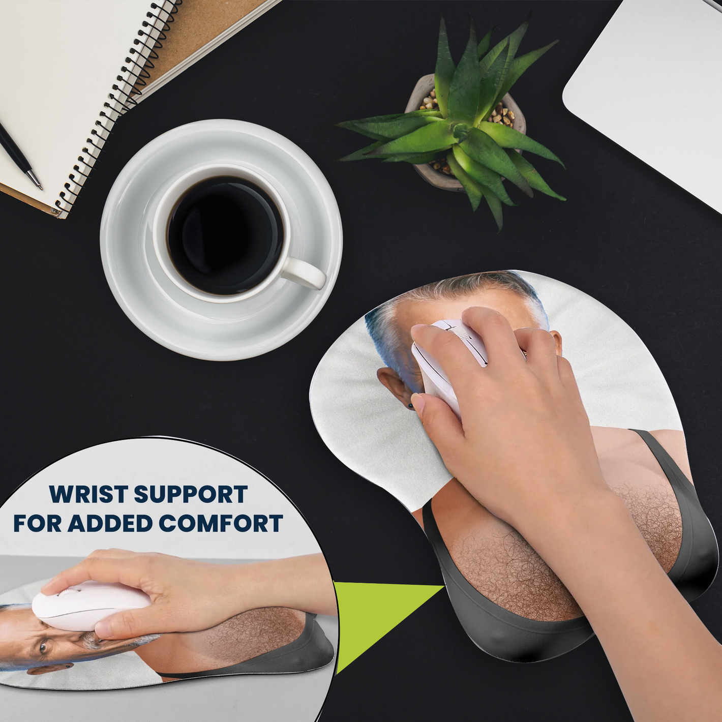 Features ergonomic wrist support for daily use while delivering constant laughs—form and function wrapped in one unique mouse pad.